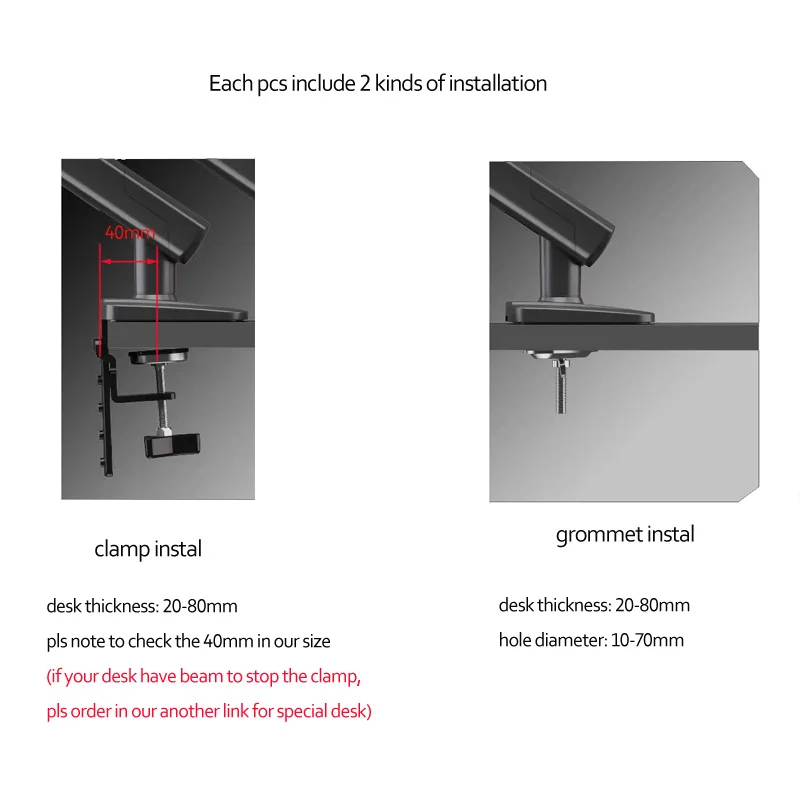 Lắp đặt kẹp: Độ dày mặt bàn 20-80 mm.