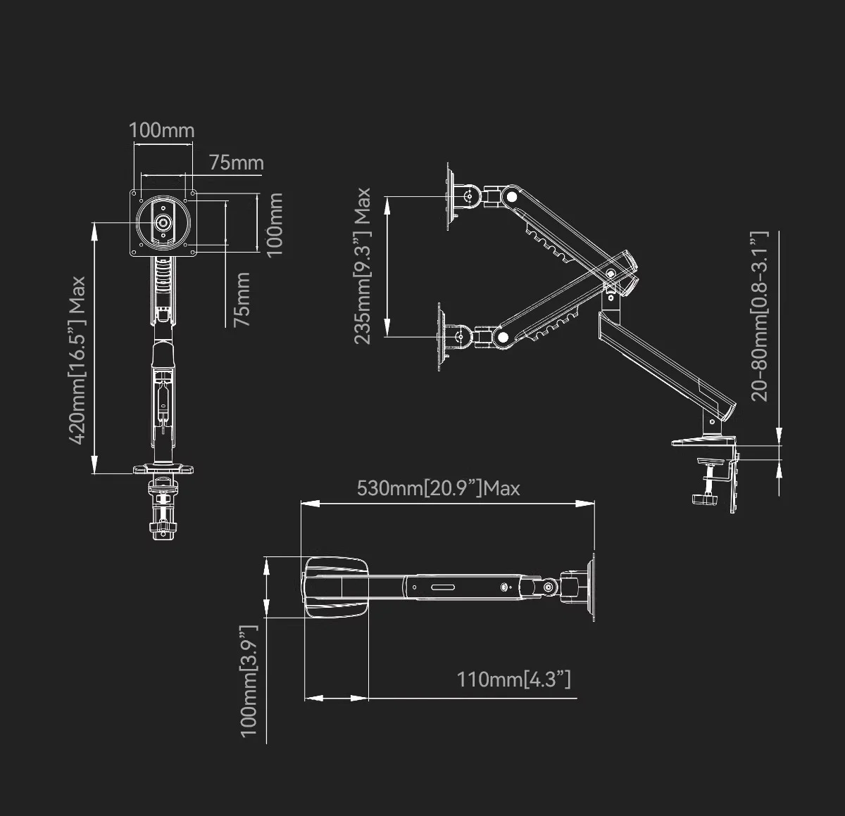 Hỗ trợ trọng lượng từ 4,4 đến 19,8 pound (2-9 kg). (Vui lòng đảm bảo màn hình của bạn nằm trong phạm vi này, nếu không khí nén của giá đỡ sẽ không hoạt động và điều chỉnh nâng hạ được
