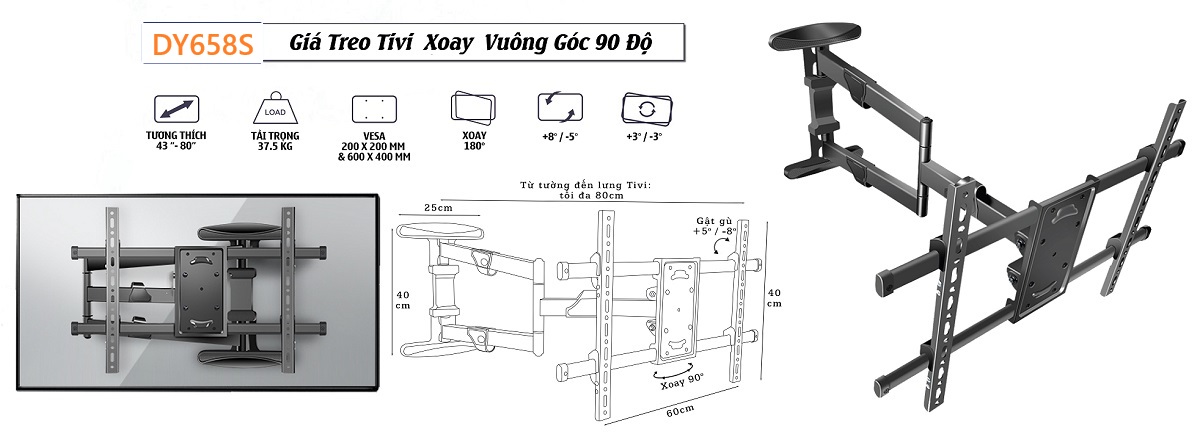Tính năng nổi bật của Giá treo tivi xoay đa năng vuông góc với tường cho tivi tới 65" DY658S 37 - 80 inch